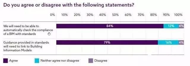 调查清楚的显示出各组织在BIM过程中使用的标准和出版物。尽管多数组织已经采用了BIM,但是没有一个标准被多数组织使用。展望未来,关于标准的信息需要被嵌入BIM,需要能够进行自动规则检验(84%),需要标准和BIM之间的链接(79%)。