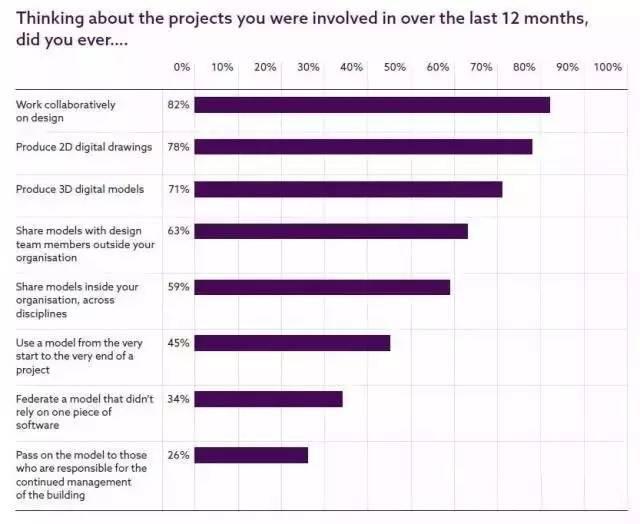 协同设计工作是标准的实践方式——71%的调查对象创建3D模型,内部分享模型的有59%,外部分享模型的占63%。然而,要把这一方式植入项目生命周期的后期阶段,还有很多工作需要完成——只有45%从开始到结束一直使用一个模型,26%的人说他们将模型用于建筑管理。
