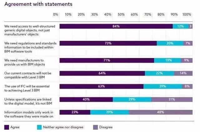 45%的调查对象说他们使用通用BIM对象库——66%的人按需创建对象,内部创建并在多个项目上使用。在BIM环境中通过BIM软件工具设定对象放置的标准和规格,也被视作关键点。