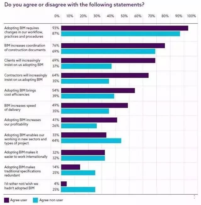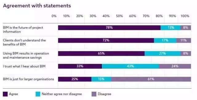 78%的调查对象把BIM看作项目信息的未来。但是,还有工作要做——65%的调查对象表示BIM在设计阶段以后,即运营和维护阶段能带来资金节约,而72%调查对象相信客户并不理解这些收益。