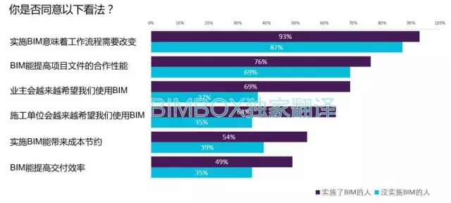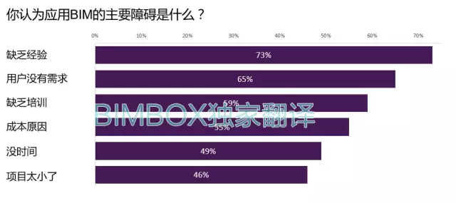 之前BIMBOX给大家翻译过一期视频,讲BIM实施的3个阻碍,在这份调研中,也提到了BIM实施的主要阻碍,一半或者一多半的人认为,实施BIM主要有这几个方面的阻碍。