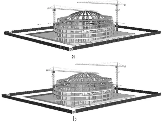 BIM施工模型包括主体结构、机械、临时支撑结构、临时办公楼、施工围挡、大门等,尽可能与实际情况相一致,通过三维模型展示各节点的施工状态,这样可以直观、形象地描述施工现场,以便论证施工方案的可行性。