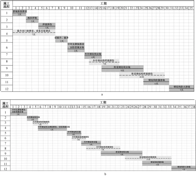 通过比较方案的优缺点,两种方案均可行。该工程钢结构安装对施工进度、造价等影响的主要因素有:钢结构构件396件(包含外围附设钢结构);其中,中环钢梁以内(整体提升部分)的钢构件57件。钢构件单件吊装占用时间为高空20~30min,地面10~15min,塔吊每天工作10h。钢结构支撑架:方案1为12个,方案2为33个。