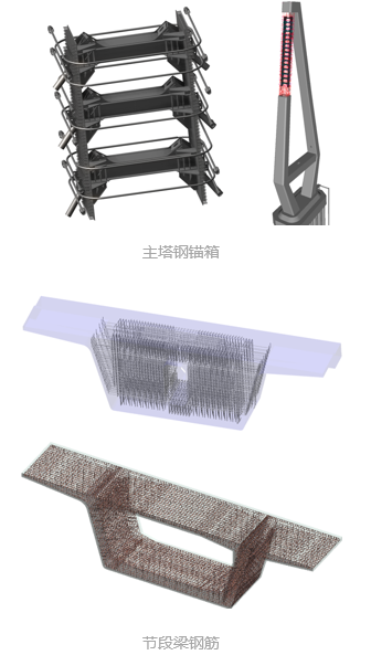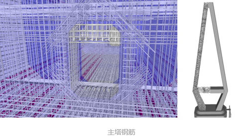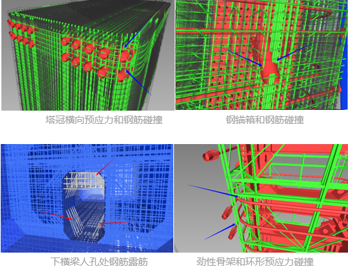 本项目碰撞检测模型包括:主塔混凝土、主塔钢筋、钢锚箱、环形预应力及劲性骨架。随着BIM技术的深入应用,发现5大类型碰撞,共6000余处碰撞,优化劲性骨架设计。
