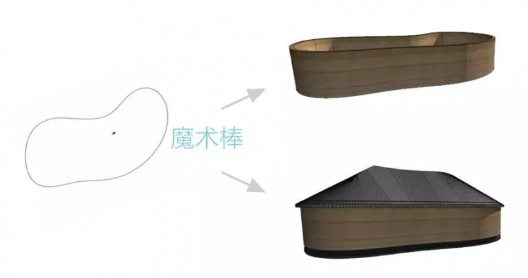 而ArchiCAD就变通的多了,你可以直接在模型里画一段异形的曲线,然后利用魔术棒直接生成曲线墙体,也可以继续利用这段曲线来生成楼板和屋顶。这在创建异形建筑的时候会非常的便利。