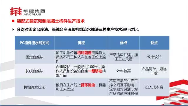 谈及装配式建筑预制混凝土构件生产技术,李总分别对固定台座法、长线台座法和机组流水线法三种生产技术进行对比。
