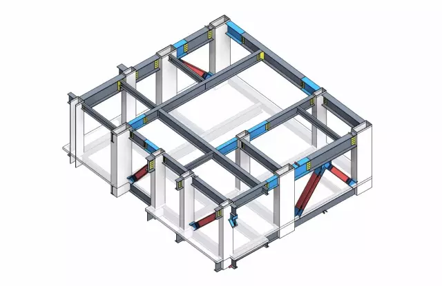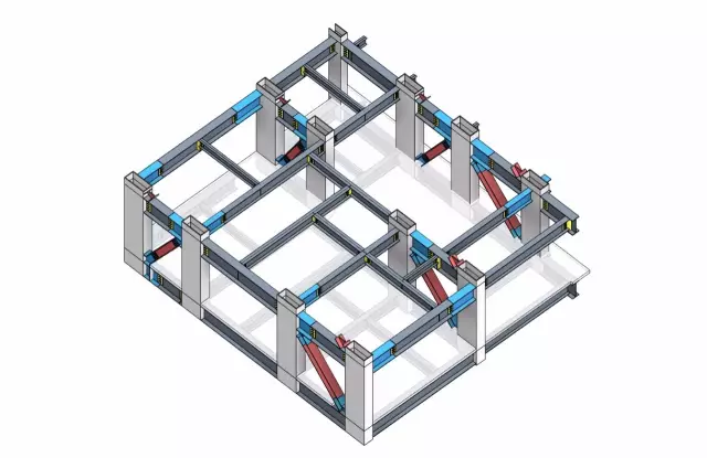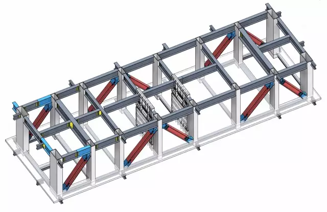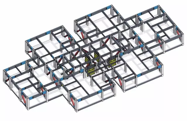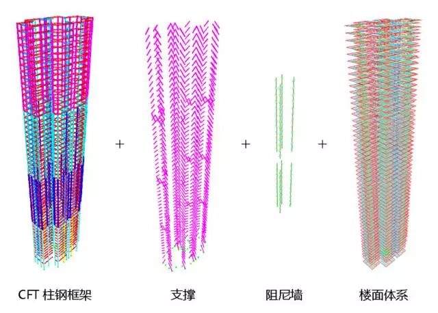 钢结构方案的结构体系构成:CFT柱型钢框架+支撑+黏滞阻尼墙。支撑布置于公共交通区域与建筑隔墙的位置,黏滞阻尼墙布置于结构的中上部,共72片。