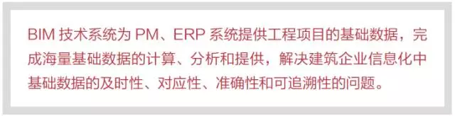 BIM 技术平台的优势在于它是一个极佳的工程基础数据承载平台,优势在于工程基础数据的创建、计算、管理和应用,主要解决“项目该花多少钱”的问题。ERP 优势在于过程数据的采集、管理、共享和应用,主要体现“项目花了多少钱”。二者是完全的互补关系,即BIM 技术系统为PM、ERP 系统提供工程项目的基础数据,完成海量基础数据的计算、分析和共享,解决建筑企业信息化中基础数据的及时性、对应性、准确性和可追溯性的问题。两个系统的完美结合,将取得多赢的结果,两个系统的价值将大幅增加,客户价值更是取得1+1 ﹥ 2 的效果。