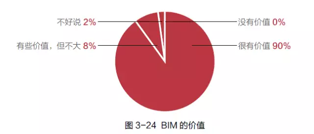 俗话说得好:没有最好,只有最合适。BIM 技术在企业中的应用也是如此,只有适合企业的才是最好的选择。根据鲁班咨询的调研(如图3-24),施工企业中有近90%的人员觉得BIM的价值非常大,没有人认为BIM没有价值。但目前大部分企业都苦于无从下手,或者还处在尝试摸索的阶段,如何成功实施BIM,成为目前大家普遍关注的问题。