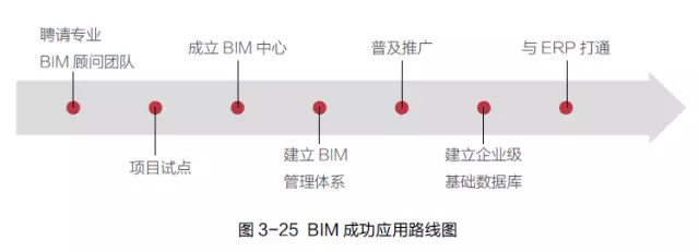 通过大量成功项目的实施经验总结,也吸取了大量失败项目的教训,鲁班BIM团队制定了BIM成功应用路线图(见图3-25)。当然并不是所有企业按照路线图实施就一定能成功,因为这里还涉及到很多客观因素,至少在成功路线图的指引下企业知道该如何来做,可以帮助企业提高实施应用的成功率。