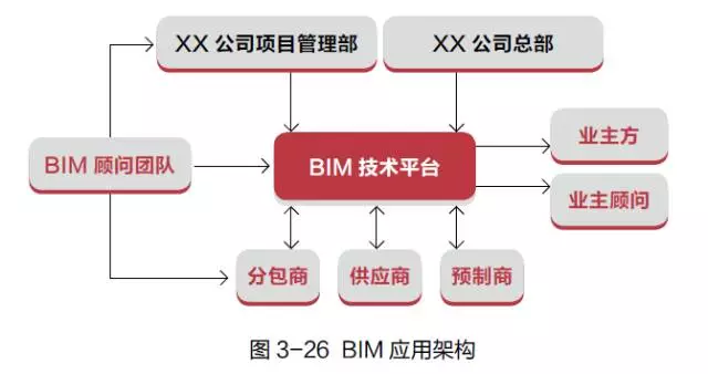 随着BIM 概念的普及以及BIM 应用案例的增加,企业对BIM 的了解程度也在相应提升,但这种认识还存在着片面性以及杂乱性。通过短时间的学习,企业通过书籍、培训、观摩等各种途径获得了大量的BIM信息,但如何对这些BIM信息进行归纳和梳理,结合企业自身形成一套可行性的方案,大多数企业还是一筹莫展。这时候聘请专业BIM顾问团队可以使企业少走很多弯路,利用专业BIM顾问团队的研究成果、案例经验,结合企业自身的情况,建立企业的BIM应用架构(如图3-26),制定BIM应用的短期和长期计划。