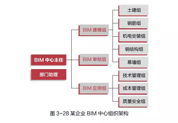 BIM 中心可以隶属于工程部、总师办或经营部管理,主要考虑BIM 技术应用与工程项目管理密切相关,同时BIM 技术也可以作为企业管理平台,为项目部和分公司提供管理服务。分公司是否需要设立BIM 中心,主要根据分公司所在区域以及项目数量,以及总部BIM 中心人力资源配备情况来决定。图3-28 是某企业BIM 中心的组织架构。
