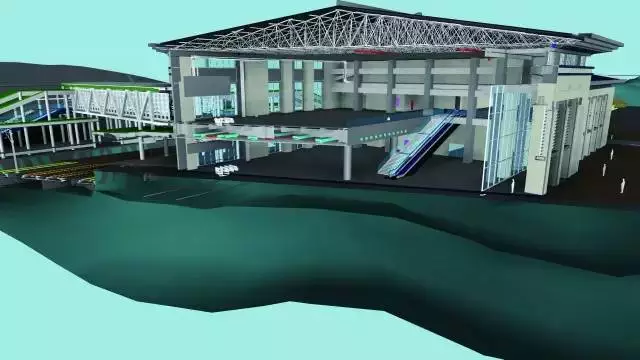 建筑、结构、暖通专业通过在Revit中协同设计完成武当山站的站房、雨棚、天桥建筑和暖通模型,达到施工图深度;机械专业利用Inventor软件进行站房内电扶梯的模型制作。