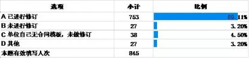 企业一方面加强与建设主管部门、税务部门、造价部门、行业协会的沟通联系,反映企业诉求;另一方面积极派员工参加相关政策学习,尤其是对中高层管理人员、项目负责人和财税人员加强营改增培训,帮助员工提高认识,更多地了解和掌握财税知识。调查数据显示,几乎所有的企业都参加过营改增政策培训学习,845家受访企业中只有5家填写未参加任何培训(见表2)。与此同时,企业加大了人力和资金投入。90%的被访企业投入资金(见表3)。82.5%的被访企业专门成立了营改增应对小组,增设税务管理人员。只有1%的企业未作任何人力投入(见表4)。96.2%的被访企业营改增后,结合增值税管理要求,建立或修订了增值税管理制度及各部门制度(见表5),近90%的企业对各类合同模板进行了修订(见表6),而且让财税部门更多地参与合同评审。