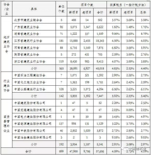 此外,由于采取一般计税的大中型项目完工并完成决算的很少,此次对于一般计税项目税负的反映,是建筑业企业根据项目实际已确认销项税额及已抵扣进项税额情况提供的数据,测算结果仅是一般计税项目阶段性税负情况。考虑到大多数项目在项目前期基本完成采购,取得大部分进项税额,随着后期工程结算确认的销项税额增多,预期项目完工税负还会大于目前测算的税负结果。