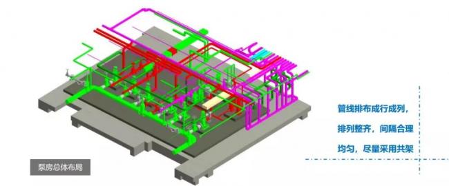 ⑤设备机房综合深化:使得管线排布成行成列,排列整齐,间隔合理均匀,尽量采用共架。