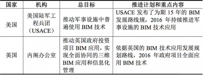 有国内权威文件称:2016年,国外 BIM 技术应用仍保持较快发展的趋势。美国、英国、新加坡等国家和地区,在政府、行业和企业的推动下已初步实现BIM 技术的市场化和普及化。亚太地区的澳大利亚、韩国等国家的 BIM 技术虽然起步相对欧美国家较晚, 但整体应用发展速度较为迅速。文件经常以美国陆军工程兵团(USACE)及英国政府内阁办公室推广BIM为例(下表)。