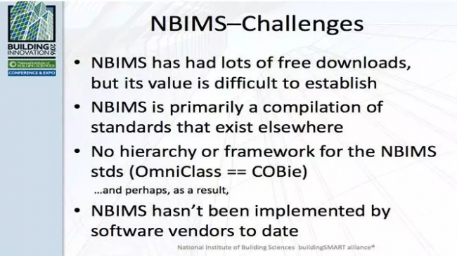 从表中可见,美国陆军工程兵团(USACE)的BIM发展路线图是以美国NBIMS为依据,2010年的BIM目标是实现项目全生命周期的数据互用。美国NBIMS标准委员会在2016年创新会议中指出:美国NBIMS面临的挑战是:NBIMS已经有许多免费下载,但它的价值很难建立确定,NBIMS是其他的标准汇编,没有层次和框架,目前为止,NBIMS尚未被软件供应商实施(图1)。