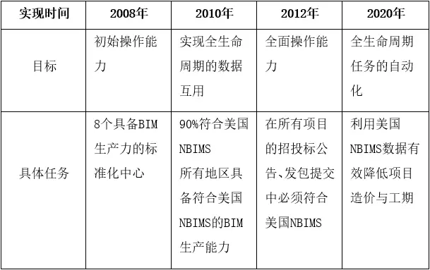 美国陆军工程兵团(USACE)为期15年的BIM发展路线规划如下表: