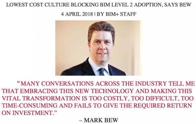 根据数字化建造领域的沙皇级人物Mark Bew的说法,对于建筑行业要克服的这个问题,如果能够成功实现BIM Level 2的应用,保守、低成本理念会是“一个巨大的障碍”。