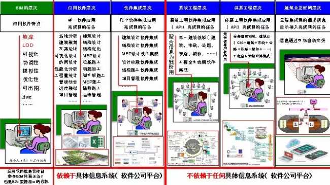 在BIM软件集成层次,我们无法实现真正BIM目标。每个企业花费大量的人力物力,请不同的软件集成商做同样的集成工作,其结果是企业被捆板于某个固定平台上,很难扩展应用,还存在企业间难以消除的信息孤岛,这已被我国建筑业信息化已经走过的路所证明了的。