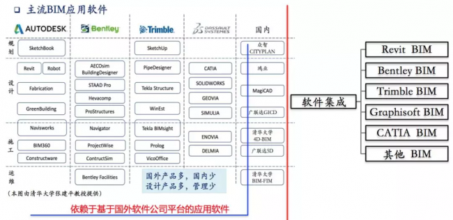 因此,我们必然看到BIM软件及软件集成层次上推广BIM依赖于国外软件公司的现状(图6):