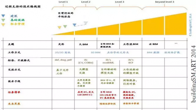 从图中可见,目前的行业平均状态在于Level 1与Level 2之间,极少应用IFC标准。可见20年来IAI提出的IFC推广并不如当初想像的乐观。
