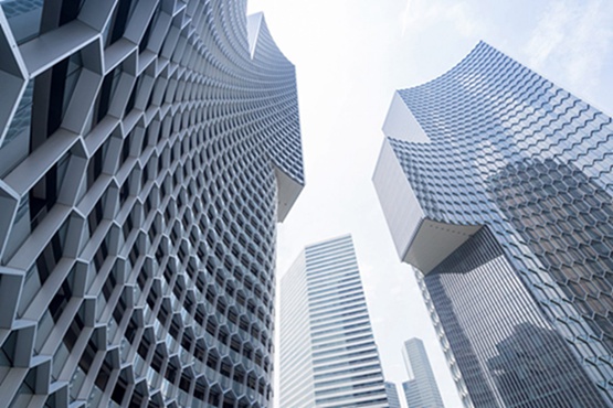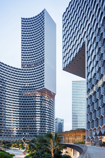 每个塔楼的一系列六角形的遮阳板,从整体看是一个蜂巢。遮阳板保护大厦不受太阳的高温和强光照射,也不影响地平线的视野。
