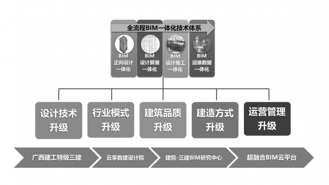 在原有BIM设计团队的基础上,依托广西建职院的场地、设备、智识资源支持,广西建工三建成立了拥有专业甲级设计资质的“广西云享数字建筑设计有限公司”(下称“云享数建”),以公司法人形式全面承担对内对外BIM设计业务,并与广西建职院开展校企合作。云享数建以BIM正向设计为特点,主要履行以下职能:(1)统合全公司BIM相关资源和业务,充分发挥聚合效应,力争实现在BIM专业领域保持长期的领先地位,增强企业核心竞争力和市场生存能力。(2)提高全公司项目BIM应用水平,透过设计院的技术与成果反哺,实际提升在各项目开发过程中应用BIM技术的深度和广度,应用与研发互相促进。(3)通过设计院的示范效应,积极响应《广西推进建筑信息模型技术应用“十三五”行动计划(2017—2020年)》的部属,成为BIM技术产业化和标准化的一大助力,倒逼我区建筑业如期完成转型升级。作为强强联合的产业应用平台,云享数建将利用校企合作的契机,不断强化业务水平、优化工作效率、深化产学研效益,争取在三到五年内成长成为BIM专业领域的标杆企业。该团队的BIM全流程一体化技术体系核心技术框架全景图如下表所示,在专业领域中具备样本意义。