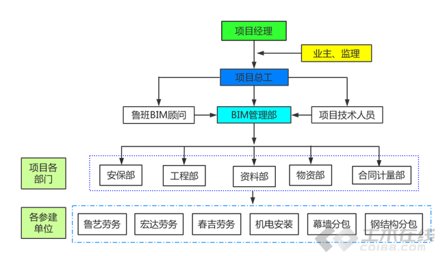 本项目的BIM工作直接由项目经理担任总负责人,领导并审核BIM各项工作,掌握BIM工作进展情况。成立项目BIM管理部由项目总工担任BIM管理部负责人,聘请上海鲁班工程顾问有限公司担任BIM咨询顾问并结合项目技术部人员共同组建BIM管理部。