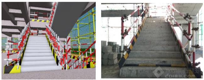 ②在模拟中对临边、洞口、楼梯等部位进行临边防护预布置,提前知晓临边搭设复杂部位和重点部位,使一线操作人员清楚具体做法和位置,增强人员安全防护意识。同时可以得出需要布置各类材料的尺寸和数量,有利于安全文明会施工的及时跟进。