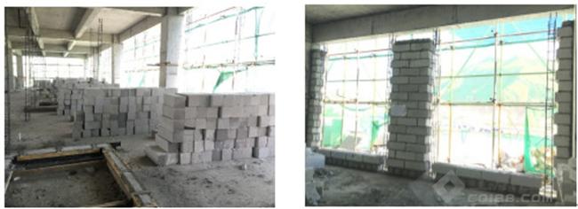 ③施工阶段:按照砌体排布图对砌体规格和数量进行堆放、规避现场材料乱码乱放、随意切割。现场施工时不仅进行三维技术交底,还在现场每面墙体施工部位张贴砌块排布图。在施工和验收过程中,严格按照砌块排布图进行。