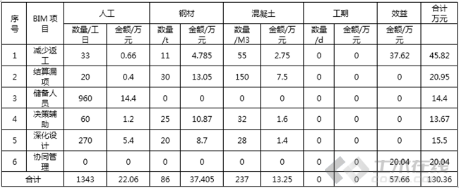 本项目直接经济效益分析主要为以下六个方面:①图纸问题会审、碰撞检查、预留孔洞等应用减少项目返工和材料浪费。②工程量数据多算对比减少结算缺漏项。③BIM培训为公司BIM技术应用储备人员。④三维可视化、施工方案模拟和优化辅助项目决策。⑤对管线和砌体进行深化设计避免材料浪费。⑥基于BIM平台实现参建方、各部门质量、安全、进度等协同管理提高沟通效率。(其中材料单价为参照西藏地区价格)