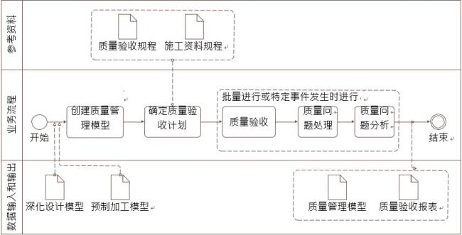 2.在质量管理 BIM 应用中,可基于深化设计模型或预制加工模型创建质量管理模型, 基于质量验收规程和施工资料规程确定质量验收计划,批量或特定事件时进行质量验收、质 量问题处理、质量问题分析工作(下图)。