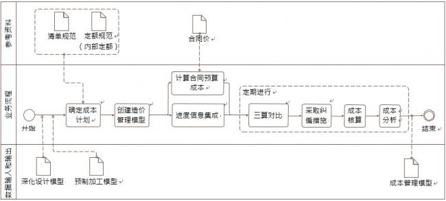 2. 在成本管理 BIM 应用中,可基于深化设计模型或预制加工模型,以及清单规范和 消耗量定额确定成本计划并创建成本管理模型,通过计算合同预算成本和集成进度信息,定 期进行三算对比、纠偏、成本核算、成本分析工作(下图 )。