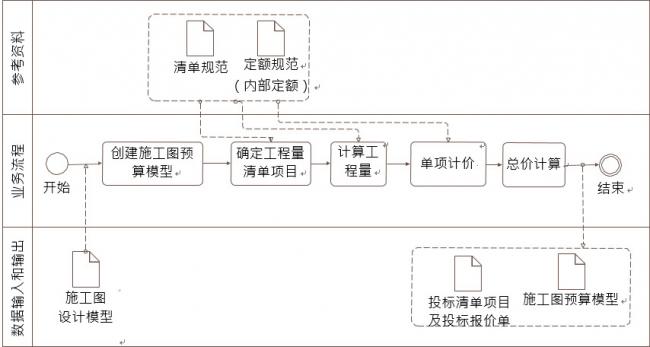2. 在施工图预算 BIM 应用中,可基于施工图设计模型创建施工图预算模型,基于清 单规范和消耗量定额(包括内部定额)确定工程量清单项目,完成工程量计算、分部分项计 价和总价计算,输出招标清单项目、招标控制价或投标清单项目及投标报价单(下图 )。