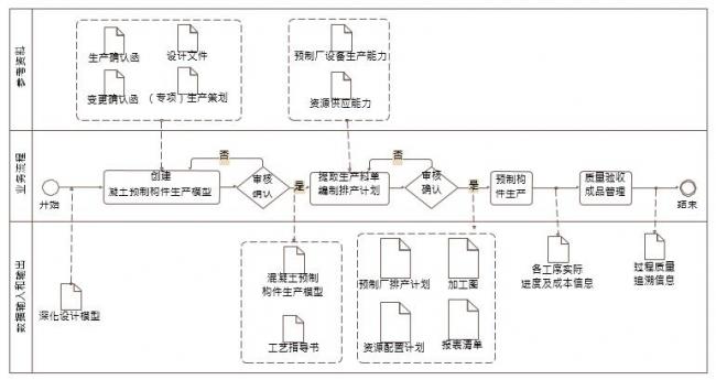 2、在混凝土预制构件生产 BIM 应用,可基于深化设计模型和生产确认函、变更确认 函、设计文件等完成混凝土预制构件生产模型创建,通过提取生产料单和编制排产计划形成 构件生产所需资源配置计划和加工图,并在构件生产和质量验收阶段形成构件生产的进度、 成本和质量追溯等信息如下图