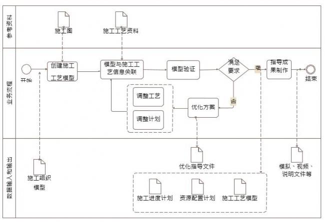 2、在施工工艺模拟 BIM 应用中,可基于施工组织模型和施工图创建施工工艺模型,并将施工工艺信息与模型关联,输出资源配置计划、施工进度计划等,指导模型创建、视频制作、文档编制等工作如下图。