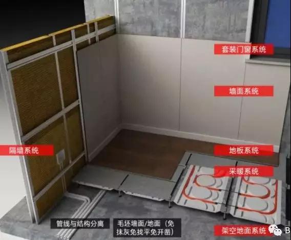 2、主要部品体系:墙面系统、地面系统、吊顶系统、隔墙系统、暖通系统、电气系统、给排水系统、集成式厨房、集成式卫浴。