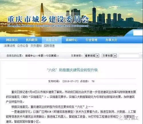 近日,重庆市政府出台关于进一步促进建筑业改革与持续健康发展的实施意见(简称“实施意见”)。实施意见要求,实施以大数据智能化为引领的创新驱动发展,加快建筑产业转型升级。