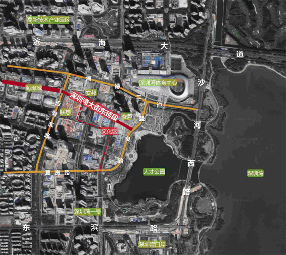 后海北起滨海大道,东临沙河西路,南至东滨路,西接后海滨路,总面积约2.26平方公里。以“三横一纵”作为规划结构,其中深圳湾大街东延段立体系统西接深圳湾大街、东通达人才公园以及海湾,南北两侧布局有重要地标性企业总部,是后海中心区未来最重要的主轴线之一,具有重要的联通、展示作用。