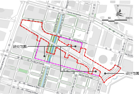 规划设计范围面积6.3公顷,研究范围面积4.8公顷。包含二层连廊980M、地面线性景观18100M2、地下空间40660M2每层,拟建2层,范围如下图: