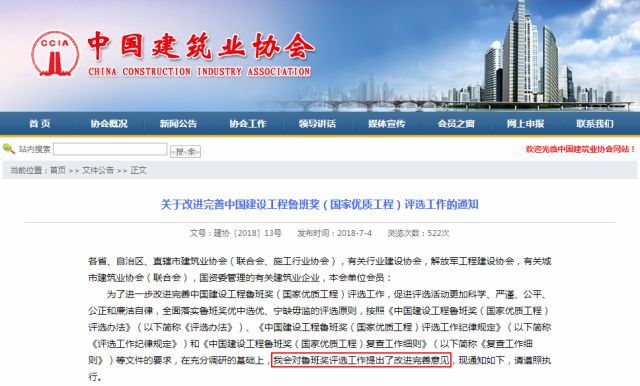 一、中国建筑业协会发布通知:改进完善中国建设工程鲁班奖(国家优质工程)评选工作。