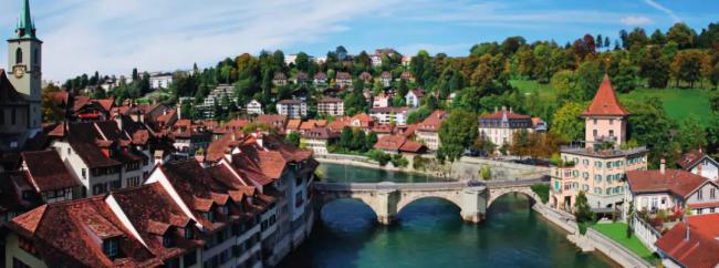 伯尔尼位于瑞士地理中心稍偏西的地方。它位于莱茵河支流阿尔河的一个天然弯曲处,湍急的河水从三面环绕伯尔尼老城而过,在这里形成了一个半岛。从空中俯瞰,伯尔尼的城市建筑非常协调,它就像一颗镶嵌在阿尔河畔的明珠,熠熠生辉。