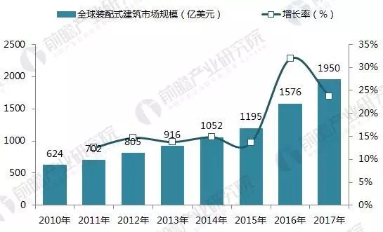 根据前瞻产业研究院发布的《2018-2023年中国住宅产业化发展模式与投资战略规划分析报告》数据显示,2016年全球装配式建筑市场规模1576亿美元,较上年大幅增长30%以上,主要是由于中国市场的快速发展,2016年中国装配式建筑市场规模增长率达到150%。2017年初步测算,全球装配式建筑市场规模达到近2000亿元。
