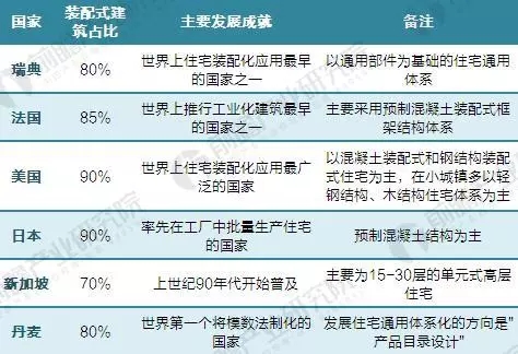 西方发达国家的装配式建筑经过几十年甚至上百年的时间,已经发展到了相对成熟、完善的阶段,日本、美国、澳大利亚、法国、瑞典、丹麦是最具典型性的国家:日本是率先在工厂中批量生产住宅的国家,美国注重住宅的舒适性、多样性和个性化,法国是世界上推行工业化建筑最早的国家。