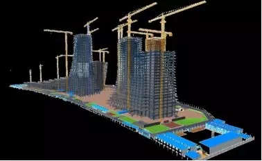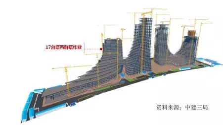本项目高峰时期有17台塔吊群交叉作业,采用BIM技术有效组织塔吊运力,避免群塔碰撞,起到了良好效果(图29)。