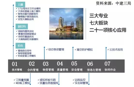 本项目应用包括了土建、钢结构和机电三大专业,七大版块的二十一项核心应用(图28)。