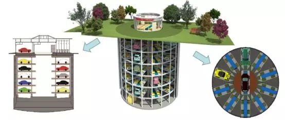 车库筒体内布局:筒体地上一层停车门亭,地下一层,分成5层停车层,每层10个车位,单个车库共50个车位。内径20m,开挖深度约17m,车库停车层净高1.80m。