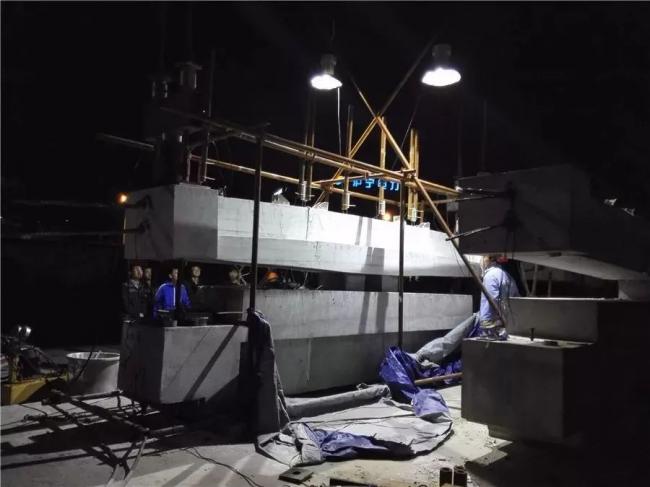10月30日下午2点,S7公路新建工程Ⅰ—2标42#墩的盖梁开始涂抹接缝环氧胶,代表着拼接工作正式开始。2小时后,经过涂抹接缝胶、吊装、就位、安装和张拉临时预应力钢筋、吊机卸载等工序,首个节段悬臂拼装盖梁成功安装完成。